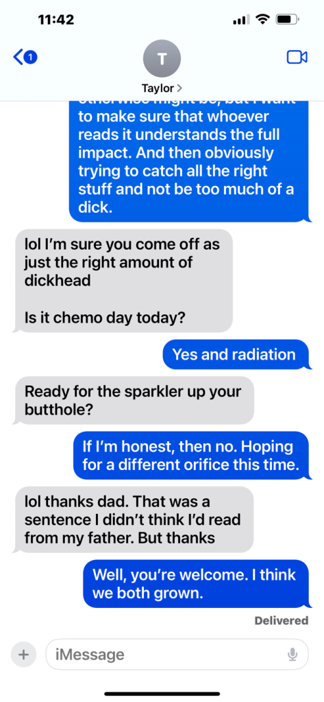 More meetings at the chemo building and then chemo started at 4:45. Similar protocol to last time, except a little shorter and wait for it… no flaming butthole this time. Its the little things you appreciate. The steroids were a much smaller dose this time.